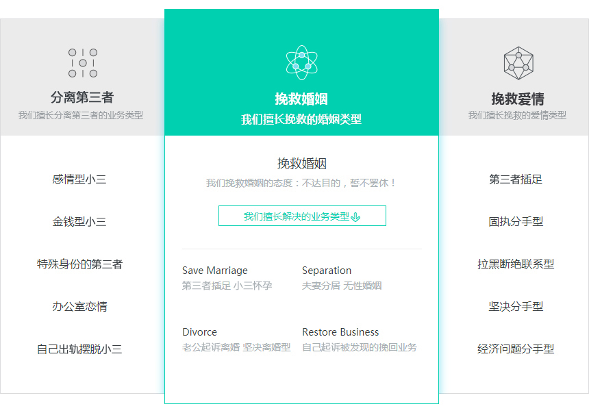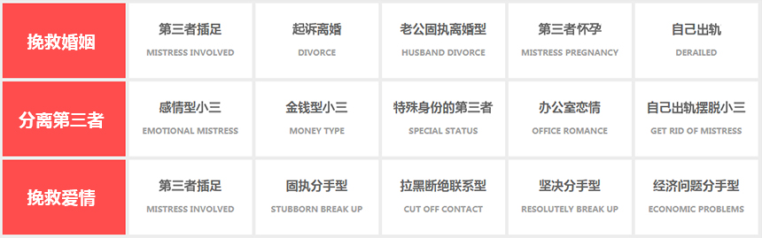 我们擅长解决的业务范围:挽救婚姻、拯救感情