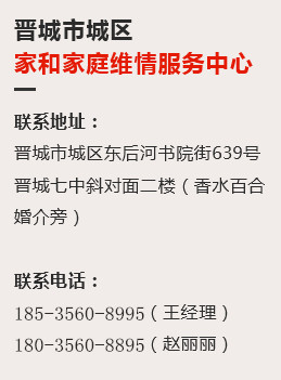 联系地址:晋城市城区东后河书院街639号晋城七中斜对面二楼(香水百合婚介旁)